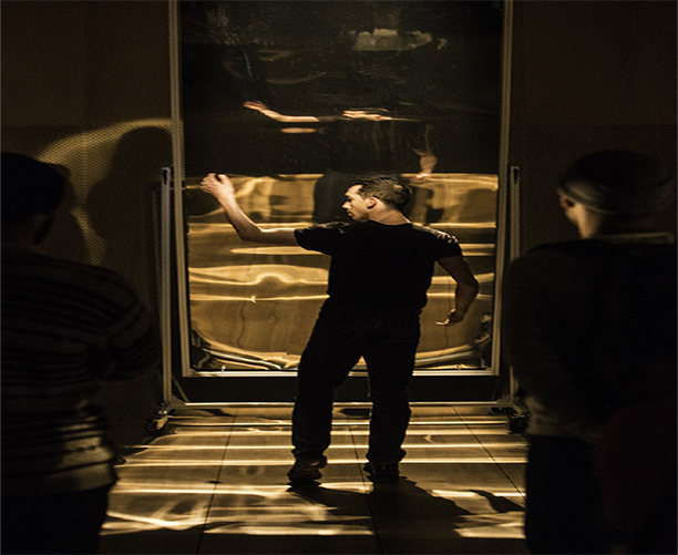 La salle est la scène de l’Auditorium de Poitiers que ferme une grande paroi en bois, ou peut-être le rideau de scène dont nous voyons l’envers. En tous cas, les sièges de l’auditorium sont invisibles aux quelques 90 spectateurs que nous sommes. Nous avons attendu quelques instants dans les coulisses et nous sommes entrés par une petite porte latérale alors que la musique avait déjà commencé. Elle est jouée par quatre instrumentistes1 de l’ensemble Ars Nova qu’entourent huit plaques métalliques vibrantes d’environ 3 mètres de haut qui forment autour d’eux une espèce de temple aux angles ajourés. Les plaques vibrantes sont ensuite déplacées facilement sur leurs roulettes, aux quatre extrémités de l’espace. Il n’y a aucun siège. Nous suivons les instrumentistes puis nous circulons de l’un à l’autre, à notre gré, ils nous tournent le dos ou nous font face, chacun jouant alternativement ou simultanément par deux ou par trois devant les plaques vibrantes. Ce sont maintenant de véritables miroirs sonores qui réfléchissent des mélodies et des rythmes joués avec douceur ou avec véhémence. Chaque plaque est équipée d’un haut-parleur qui diffuse sur un large spectre de fréquences des sons que les musiciens ont enregistrés au préalable, par fragments. L’ensemble est donc composé de sons réels et de sons enregistrés dont le compositeur règle in situ la balance et le calibrage. Il se promène parmi nous avec des écouteurs et son outil connecté autour du cou, un ipad. Il est l’ultime opérateur d’un étrange continuum spatial et sonore. Un continuum qui n’admet pas un seul centre opérationnel comme un orchestre qui le trouve en son chef vers qui tous les regards convergent.